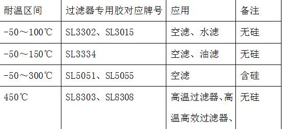 我們將過濾器專用膠按所需的耐溫區(qū)間來分類,供您參考,具體如下表: