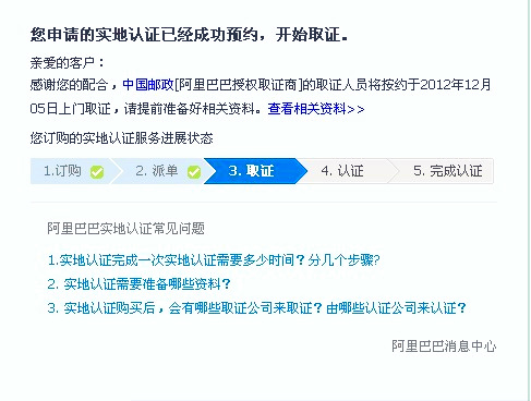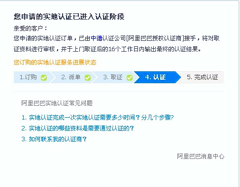 阿里巴巴實(shí)地認(rèn)證服務(wù)分為取證與認(rèn)證兩個環(huán)節(jié),取證服務(wù)有特定的取證商:中國郵政和中誠信;認(rèn)證服務(wù)有特定的認(rèn)證商:中誠信,杭州中德,北京匯華。如果你那的材料齊全,在上門取證后的16個工作日內(nèi)會有認(rèn)證結(jié)果(認(rèn)證成功或認(rèn)證失。,并且到時會有旺旺浮出提醒。