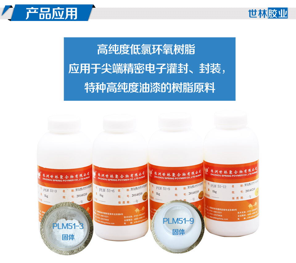 高純度低氯環(huán)氧樹脂  PLM51-3  是專業(yè)用于高尖端電子產(chǎn)品封裝和高尖端電子產(chǎn)品灌封的原材料將這些高純度低氯環(huán)氧樹脂加入到他們原來的配方體系里面,降低灌封膠的總氯含量,改善電子灌封膠的耐腐蝕性能,令電子產(chǎn)品能更好起到封裝效果,能更好的應(yīng)用于大型產(chǎn)品裝配中,起到很好的鏈接作用。